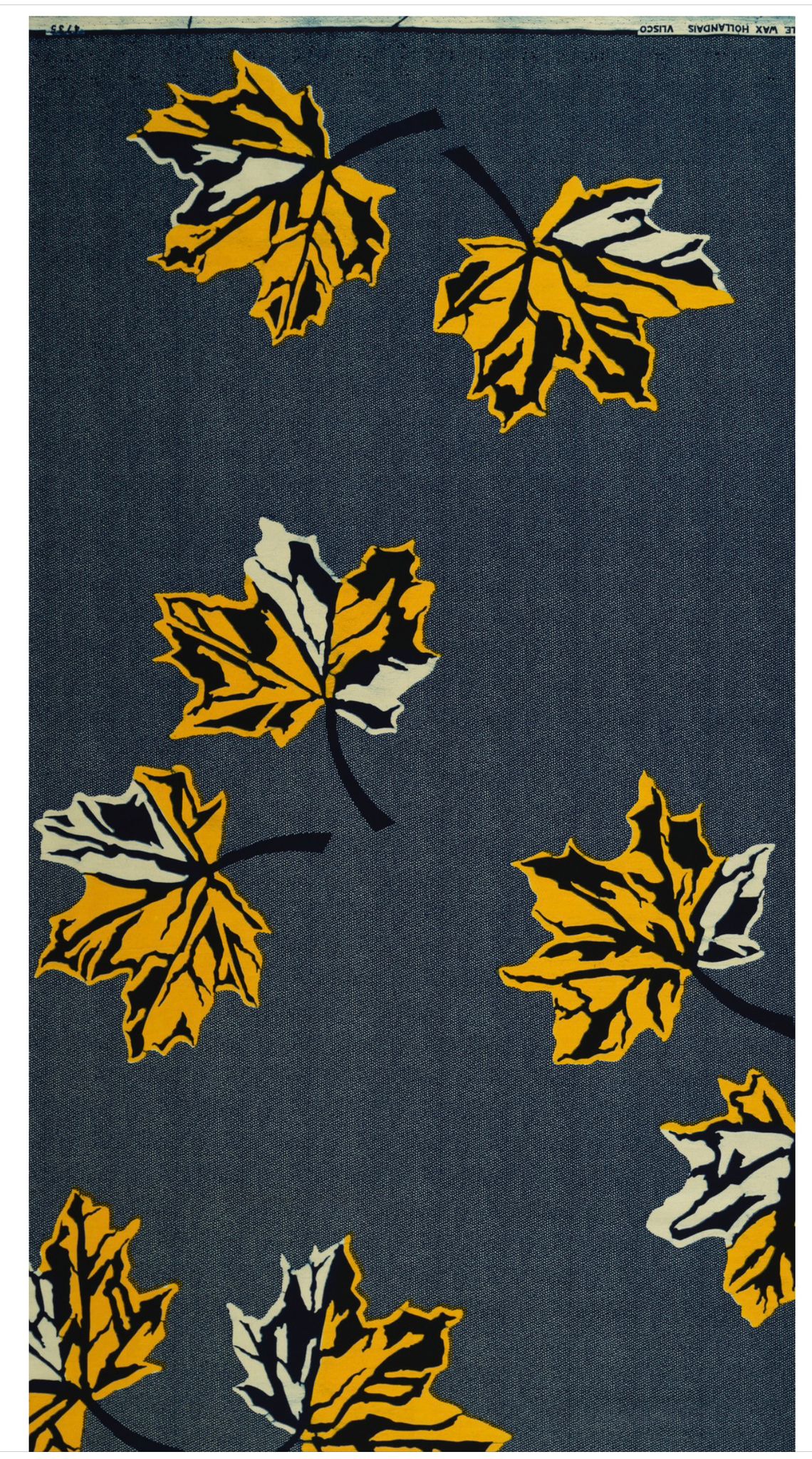 Feuilles d'érable stylisées avec zébrures graphiques sur fond bleu ardoise élégant.